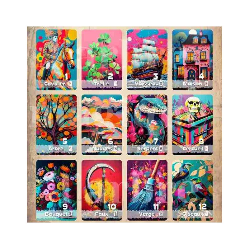 Descubre el oráculo Petit Lenormand "Jaurel", reinventado con vibrantes ilustraciones Pop Art.