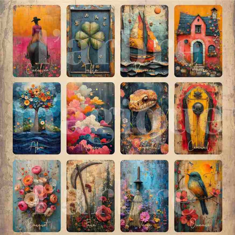 ✿ Cartes réalisées à l'atelier, découpes comprises (dans le menu optez pour HM pour Handmade). Vous avez la possibilité de choisir une fintion mate ou glossy, en mini format 6x4 cm ou en format standard soit 6x9 cm, livré dans un petit sac organza. Les cartes sont EXPEDIées SOUS DEUX A TROIS JOURS, le deck est réalisé à la commande. ⚠️ Attention : soyez bien vigilant(e) lors du choix de la dimension souhaitée ! Vérifiez attentivement votre sélection avant de passer commande.
