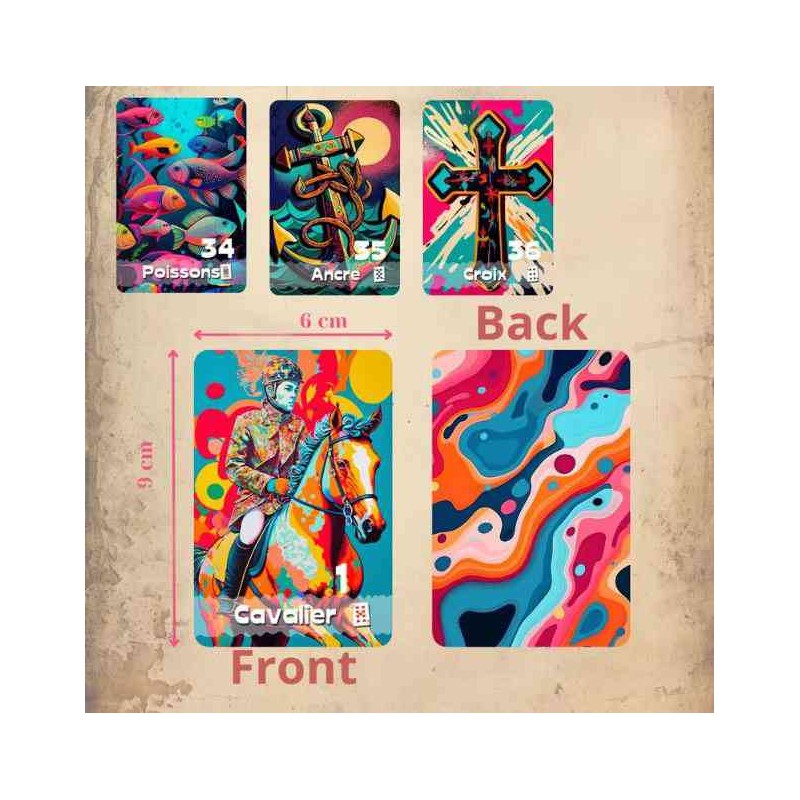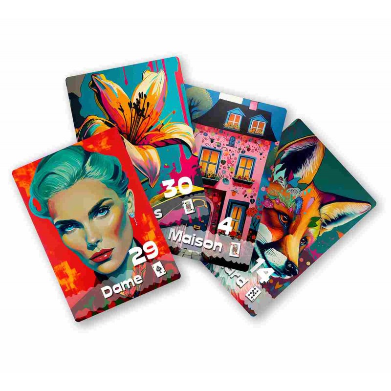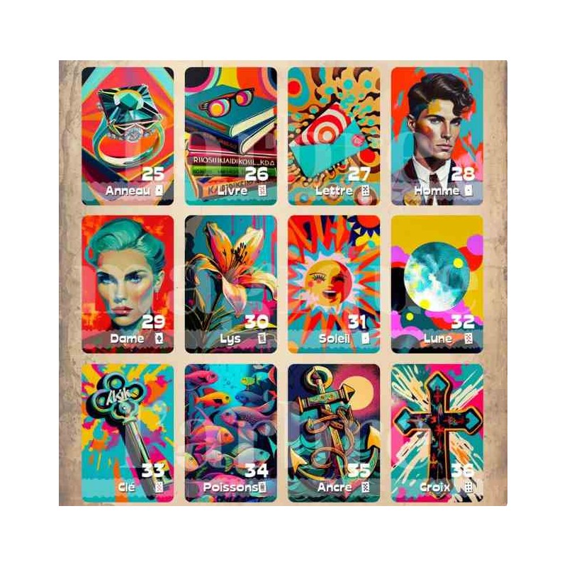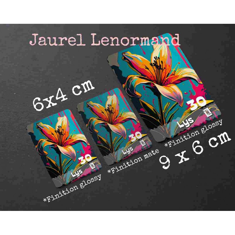 Scopri il mazzo di carte "Jaurel" Petit Lenormand Oracle, rivisitato con vivaci illustrazioni Pop Art.